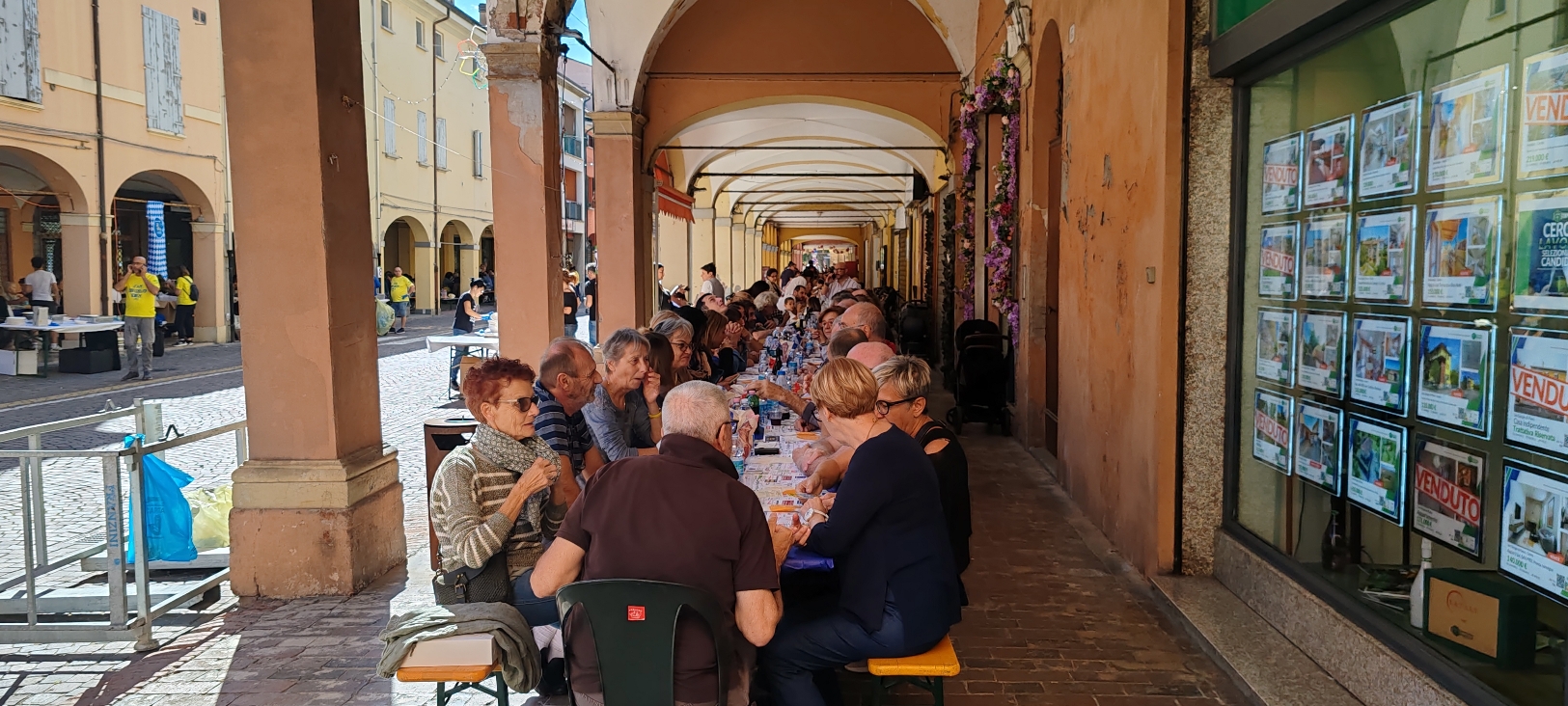 Menù: Penne amatriciana, Salsiccia alla griglia e patate al forno. Possibile anche menù vegano.Una grande tavolata di beneficenza sotto i portici di via Libertà, per stare in compagnia e pranzare insieme a tutto il paese!