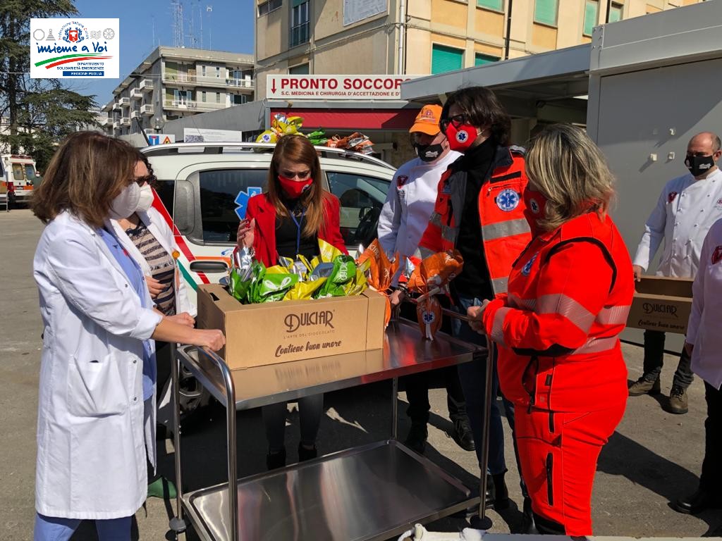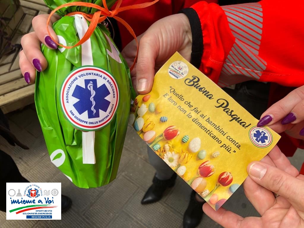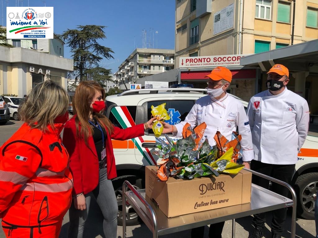 Oggi 31 marzo il DSE Puglia a Martina Franca (Ta) in collaborazione con l’Associazione Volontari di Soccorso “San Giuseppe” hanno donato 80 uova di Pasqua presso l’Ospedale Presidio Valle d’Itria ai reparti di Ostetricia, Pediatria, Nefrologia e Dialisi e presso la Casa del fanciullo perchè un dolce fa sorridere il cuore e l’animo